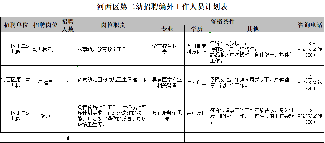 根据天津市河西区第二幼儿园的工作需要,决定招聘部分岗位编外工作人员,确定聘用的编外人员与天津赛达人力资源开发有限公司按规定程序订立劳动合同,派遣到幼儿园相应岗位工作,现将有关事项公告如下:
